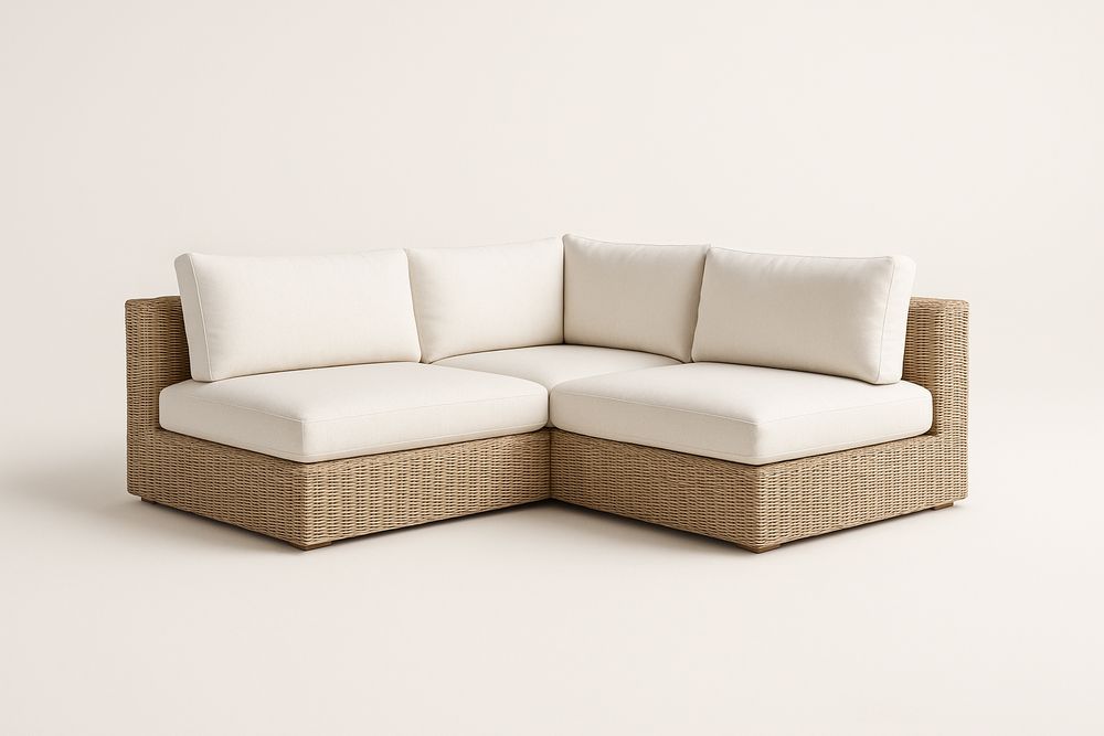 Matériaux : structure en osier tressé, coussins en tissu polyester